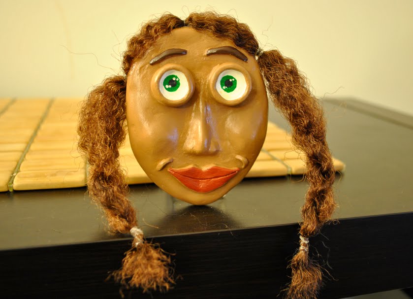 Well here is the project that I had refrained from showing before. Her name is Joy and she is the first I’ve made with a smile. I’m not quite sure what to do with her. Should be me a wall mask or a magnet for the fridge?
