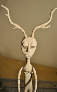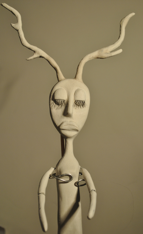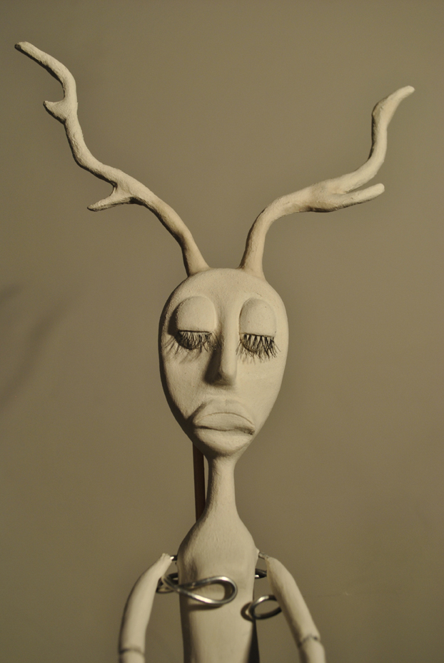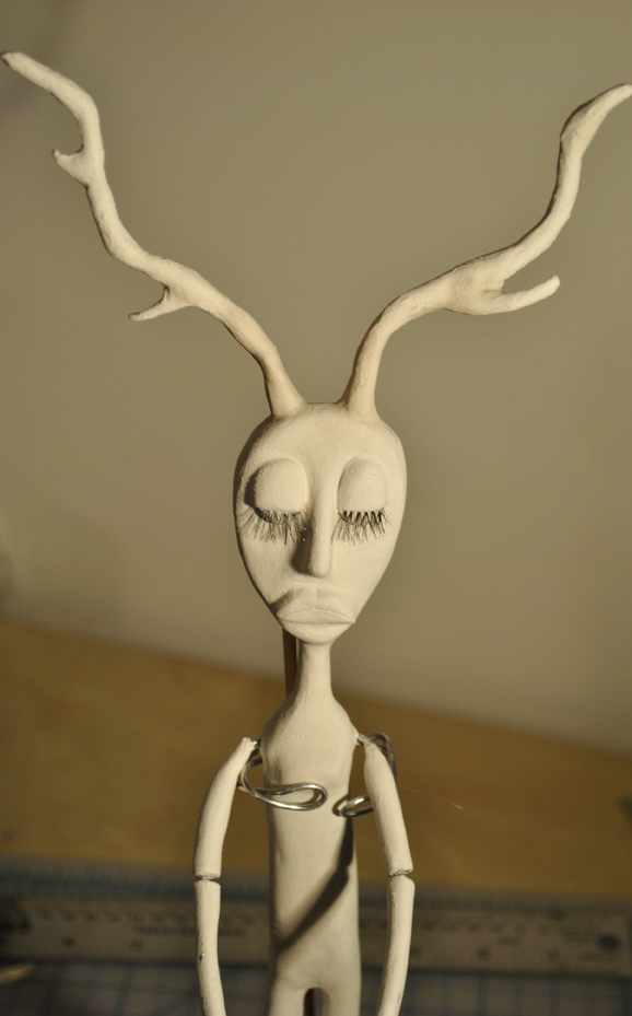 I was inspired to make this doll after seeing The Alexander McQueen exhibit at the Metropolitan musuem of art. He had a beautiful dress made out of ruffles of lace and the model wore antlers to top off the look. The look was called the ghostly bride. I thought it would be interesting to try some antlers out to change things and keep evolving.