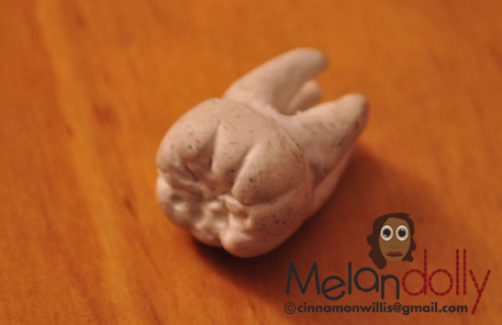 I’ve decided to make a tooth for Boo to hold so that she could be some sort of vampire tooth fairy. I made this one out of polymer clay because of the firmness which makes it easier for me to shape. I’ve been working with paperclay for my dolls because of how rough polymer clay is on my hands but I think it’s too soft for this job. I figured I go back to polymer for this small addition. My other gripe I have with it is that I can’t seem to keep this stuff clean. I manage to get every little speckle of dirt on it that I can. Anyone have a way to get around this? I’m going to paint over it anyway but I’m sure someone has the secret.