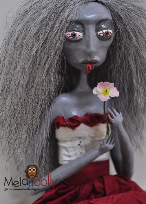 The funny thing is that making a zombie doll was the furthest thing from my mind when I originally started this one. When I let the clay dry, I noticed that her bone structure was a bit strong. That was the moment that I realized what she had become. But don’t let her looks fool you, she’s quite the intellect. She also likes flowers….