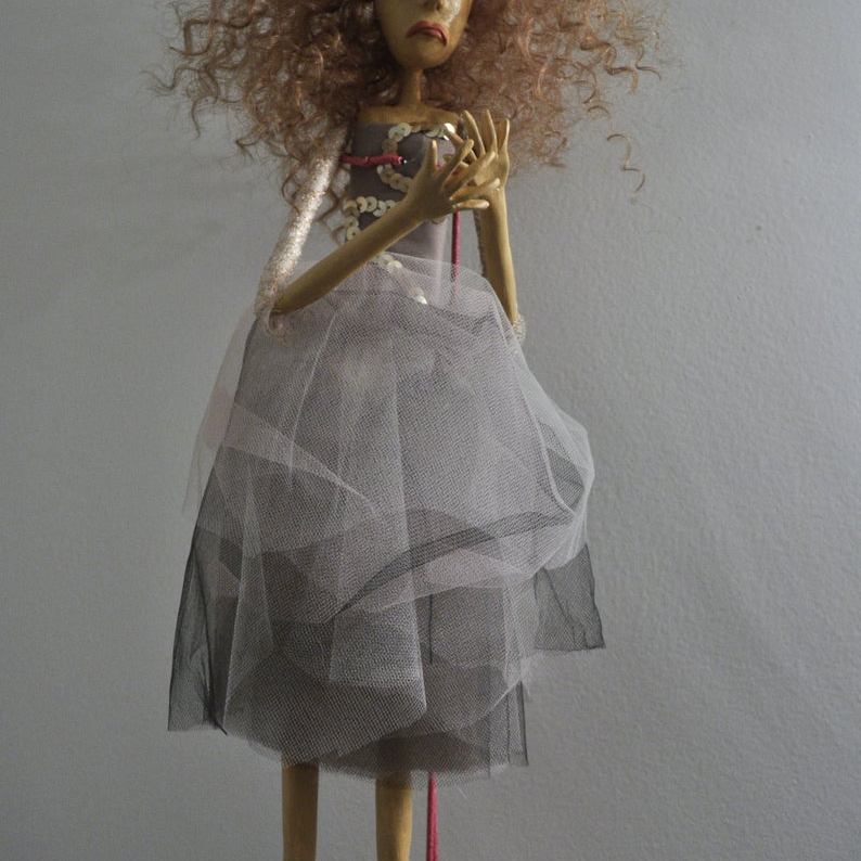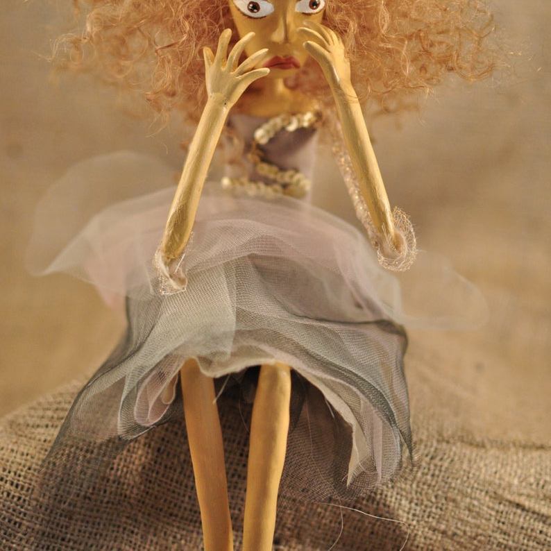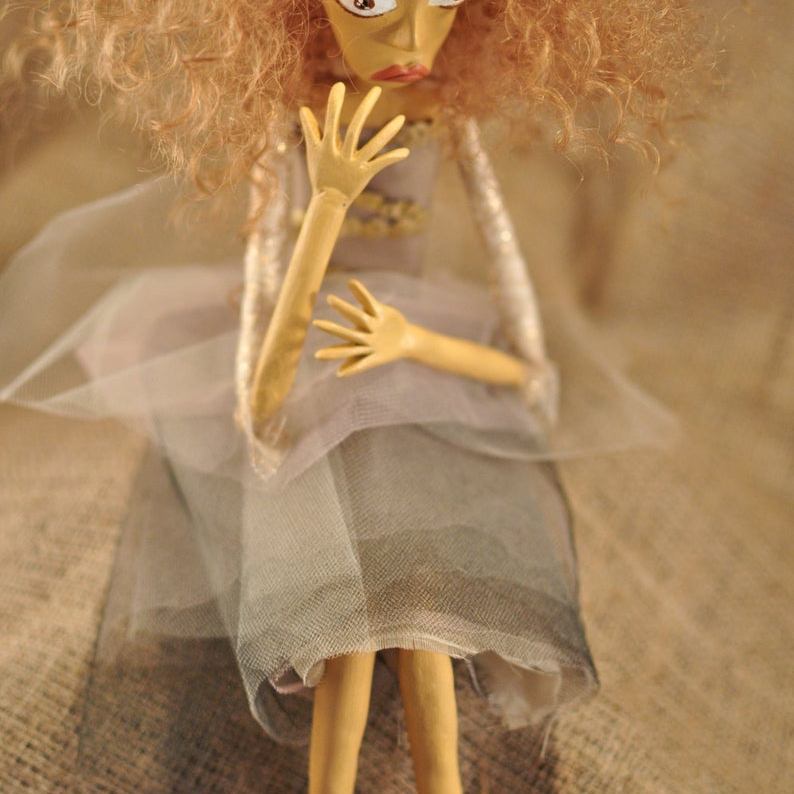 Nancy is handcrafted out of paper clay, her dress is made with tulle and her arms are slightly posable. She has been painted with acrylic paints and sealed with a protective finish.