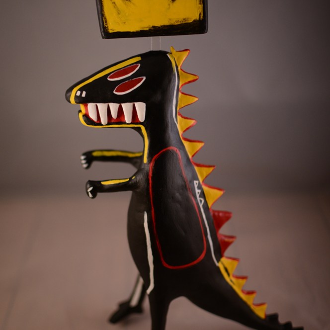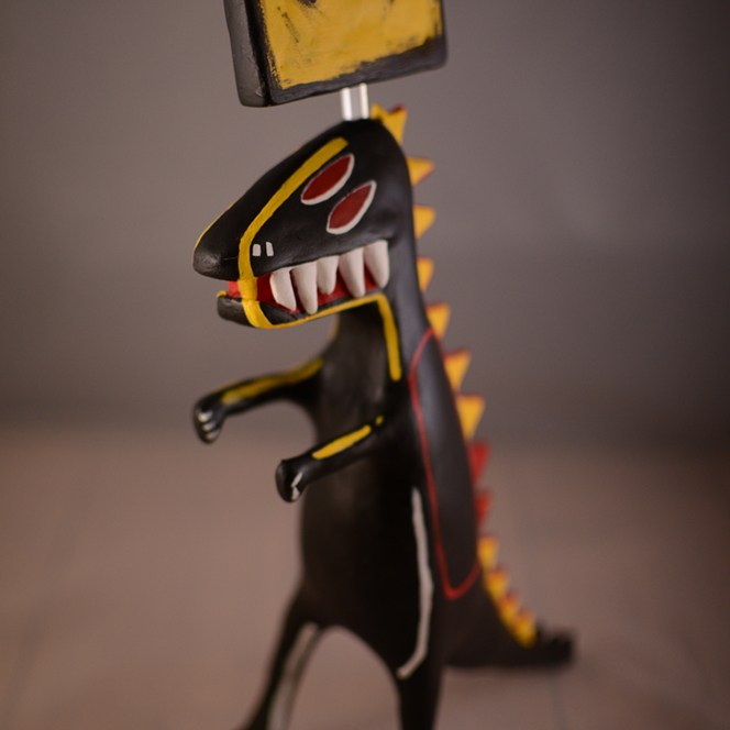This piece is directly derived from Jean-Michel Basquiat’s Pez Dispenser painting. It is made out of Creative paperclay, it stands at 11″ tall, and is 5″ long from the foot to the tail. The crown is mounted on a clear plastic rod that can be removed from the base of the dinosaur’s head. The piece can be displayed from both sides but it is intended to be shown left facing as in the original painting.